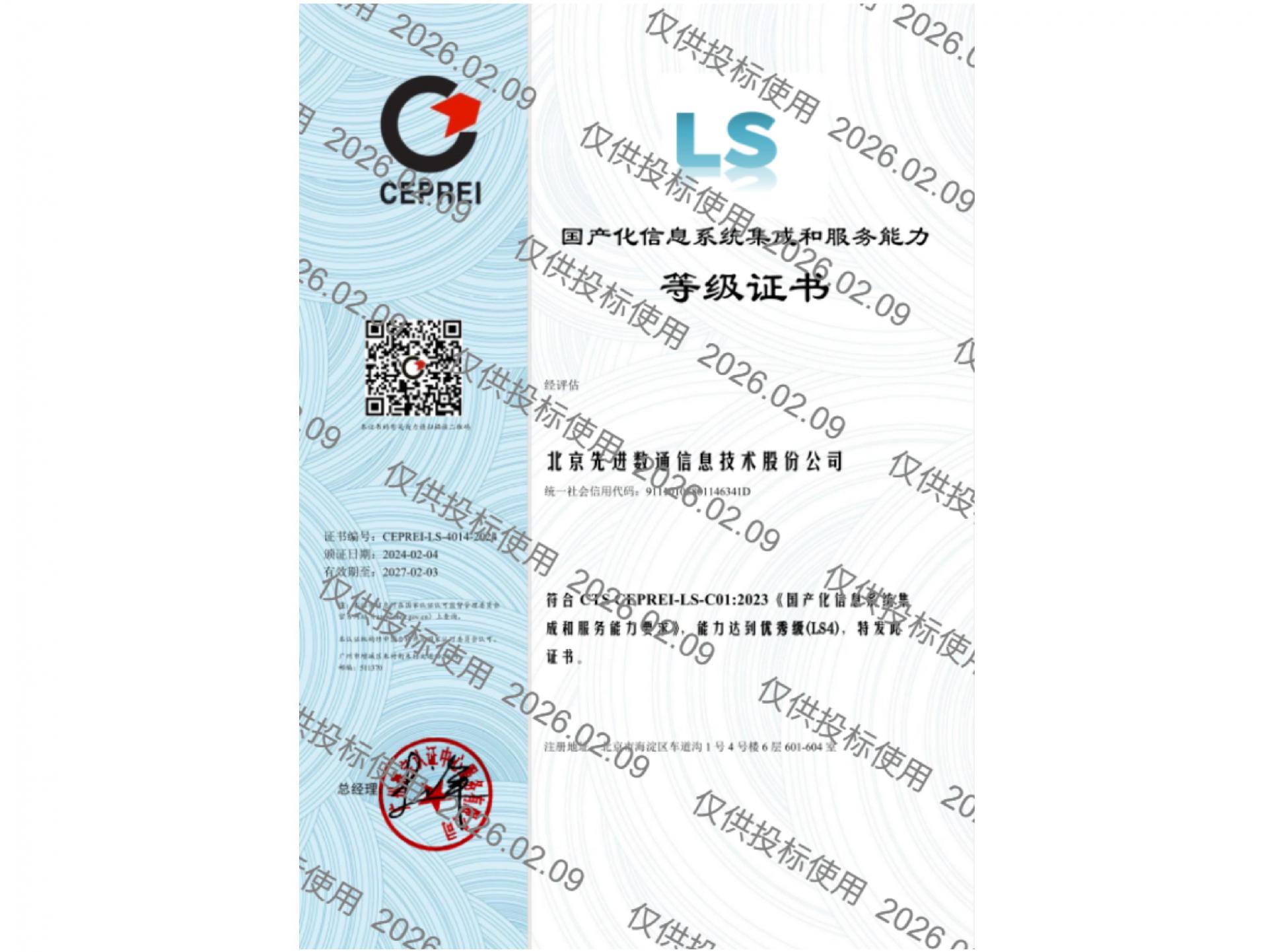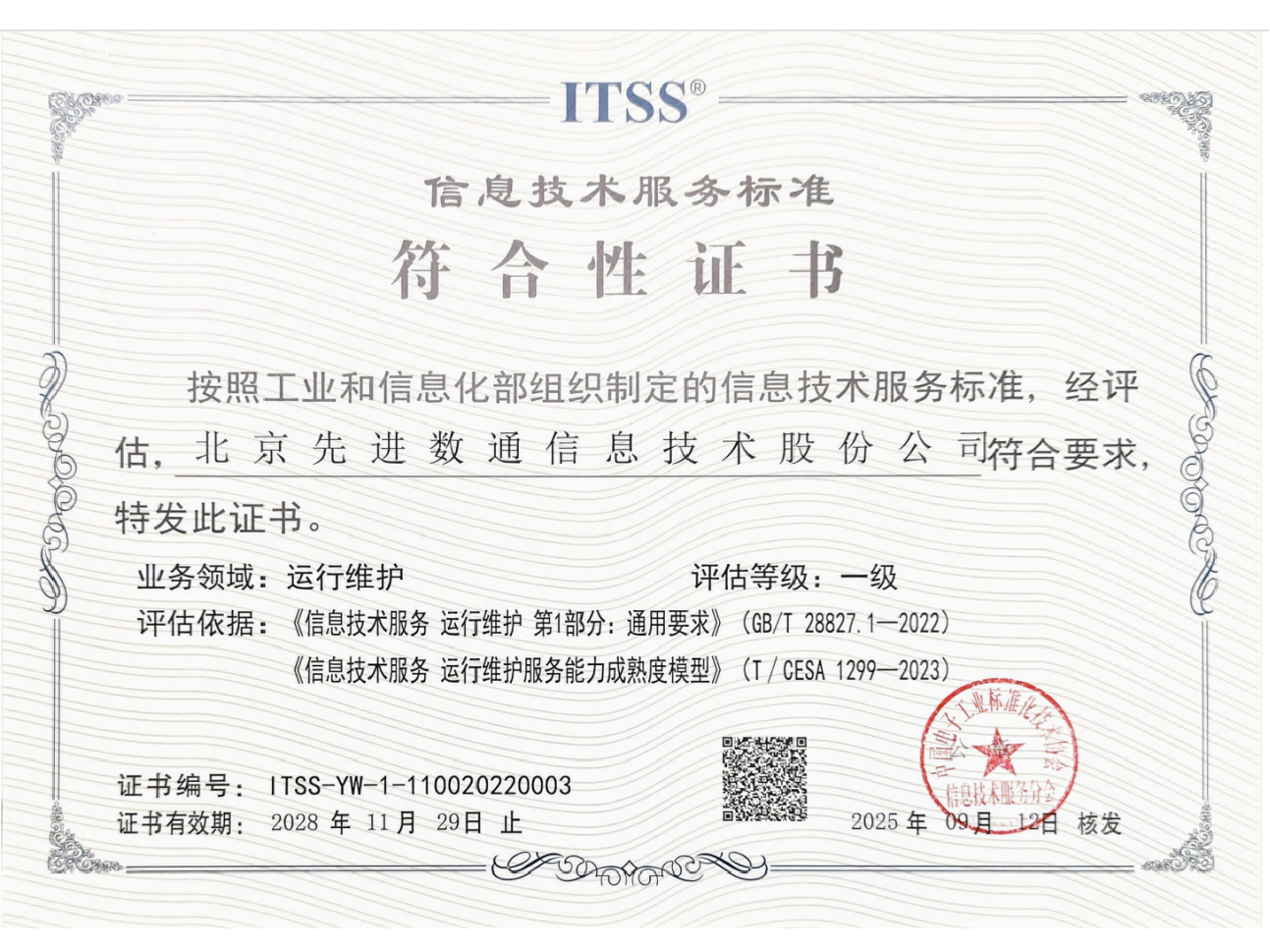 先进数通先后获得CMMIL5、软件能力成熟度五级(SPCA 5)、信息系统建设和服务能力评估体系(CS)5级、ITSS成熟度一级、信息系统安全集成服务资质二级、信息系统安全运维服务资质二级、国产化信息系统集成和服务能力评估四级(LS4)、北京市企业技术中心等资质认证,并获得ISO9001、ISO20000、ISO27001、ISO14001、ISO45001、ISO22301、ISO37001、ISO28001、GBT29490等标准体系认证,具备行业领先的技术开发、工程实施及服务保障能力。