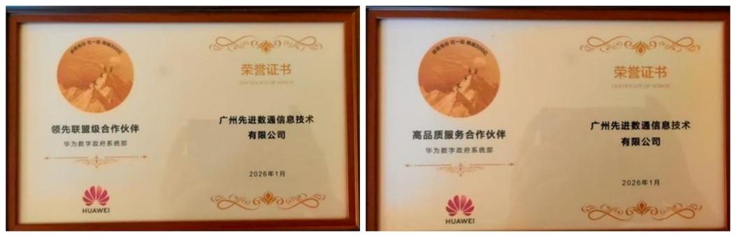作为华为生态中的核心力量,先进数通始终与华为并肩作战,在鲲鹏、昇腾等核心技术落地中主动担当,助力构筑全国性产业格局;两项荣誉的背后,是先进数通多年来在数字政府领域的持续深耕,更是与华为 “双向奔赴、共赢发展” 的生态默契。