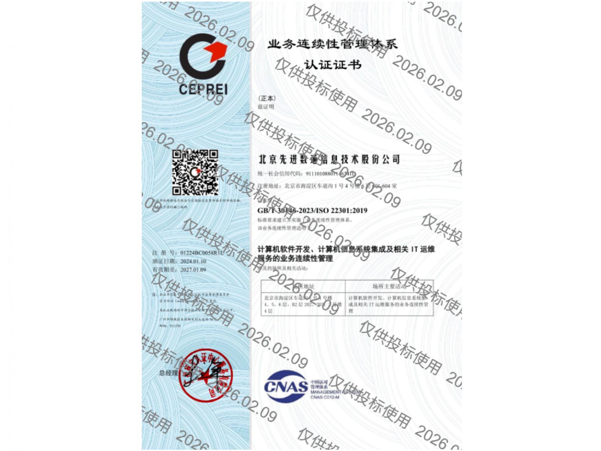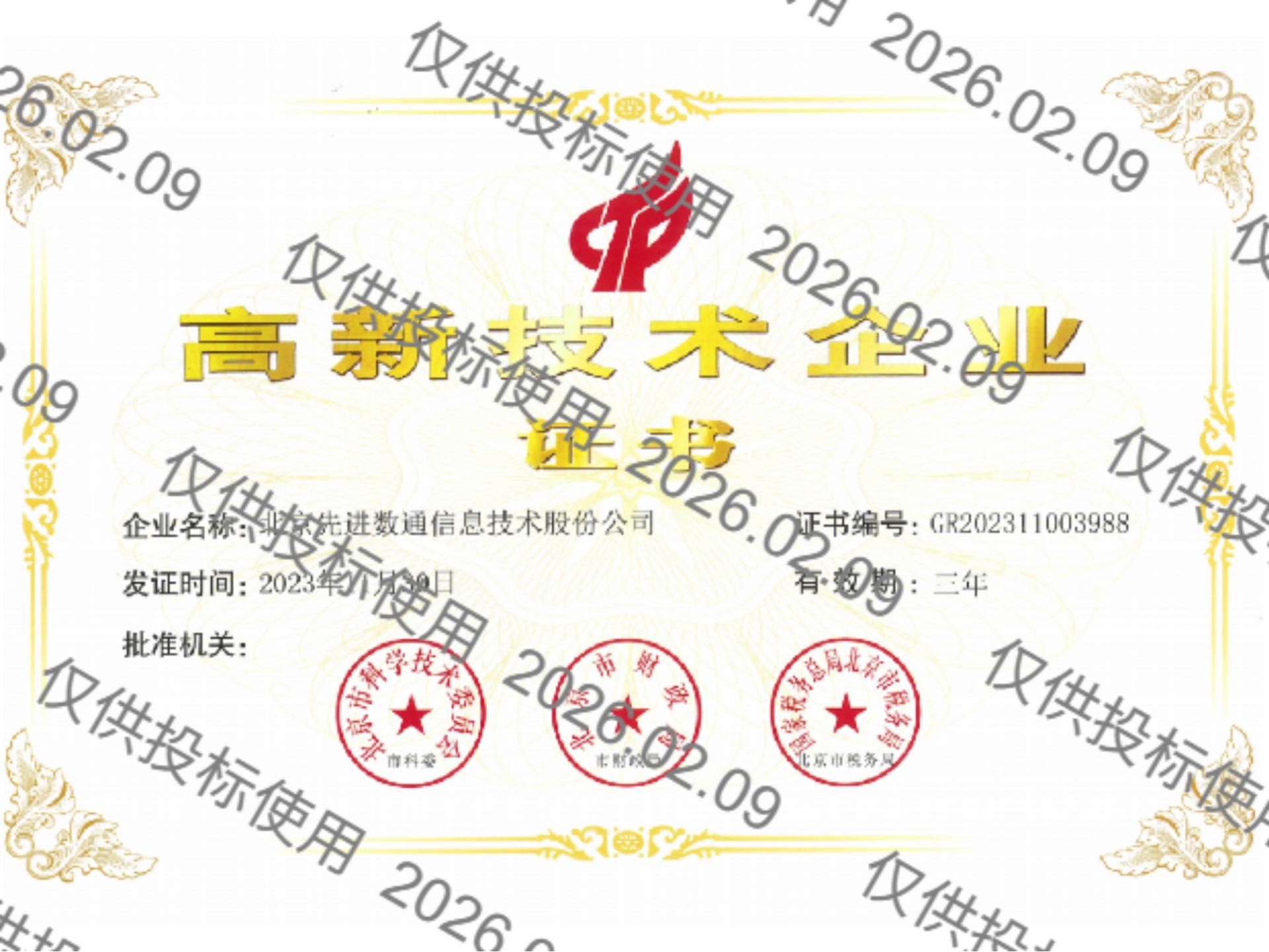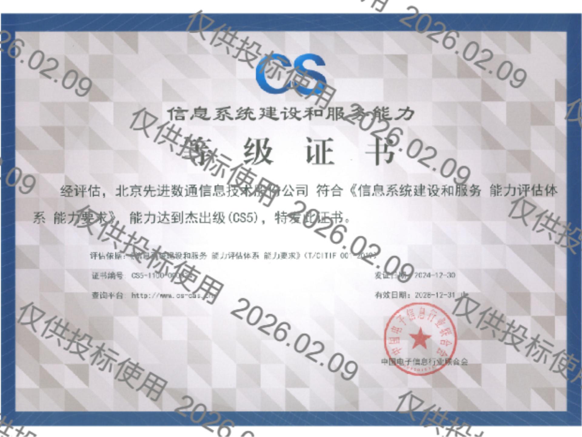 先进数通先后获得CMMIL5、软件能力成熟度五级(SPCA 5)、信息系统建设和服务能力评估体系(CS)5级、ITSS成熟度一级、信息系统安全集成服务资质二级、信息系统安全运维服务资质二级、国产化信息系统集成和服务能力评估四级(LS4)、北京市企业技术中心等资质认证,并获得ISO9001、ISO20000、ISO27001、ISO14001、ISO45001、ISO22301、ISO37001、ISO28001、GBT29490等标准体系认证,具备行业领先的技术开发、工程实施及服务保障能力。